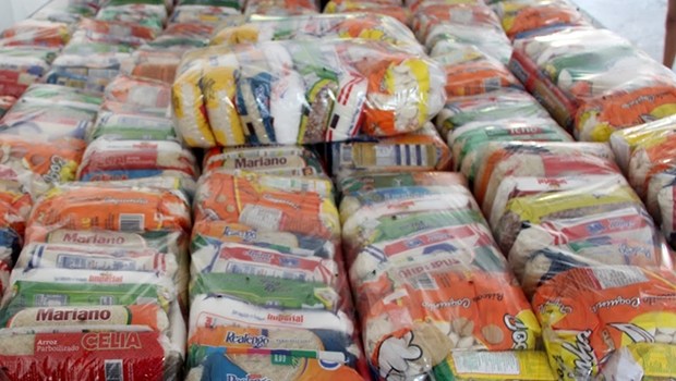 As cestas contam com 10 quilos de arroz, 5 quilos de açúcar, dois quilos de feijão, dois pacotes de macarrão, três latas com óleo, achocolatado em pó, extrato de tomate e um pacote de café.