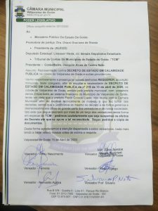 O ofício endereçado ao Ministério Público TCM e Assembleia Legislativa, certamente orquestrado por Lêda Borges, leva a assinatura do vereador Alceu Nascimento, Ferreira, Paulo Galego, Elvis e Silvano e Requer que seja suspenso os efeitos do Decreto, até que se apure tal necessidade.