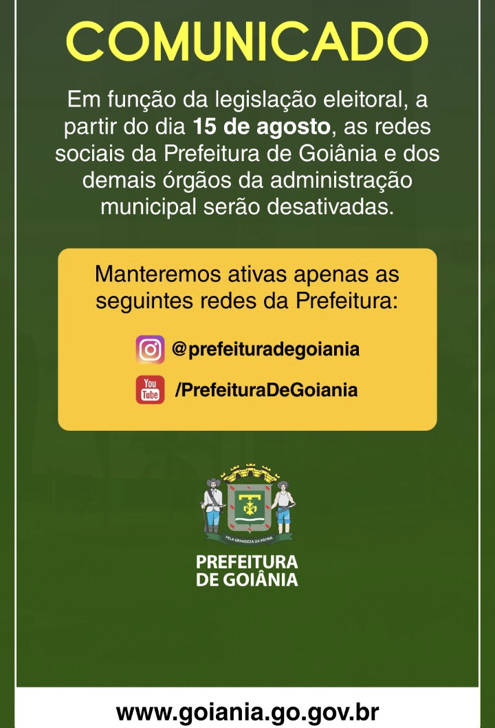 A lei balizou a decisão da prefeitura que vai retirar do ar as suas redes sociais e de todas as secretarias e demais órgãos municipais. Deverão permanecer ativos apenas o Instagram oficial da Prefeitura de Goiânia e o seu canal no Youtube. O site oficial da administração municipal continuará no ar disponibilizando todos os serviços online para o cidadão.