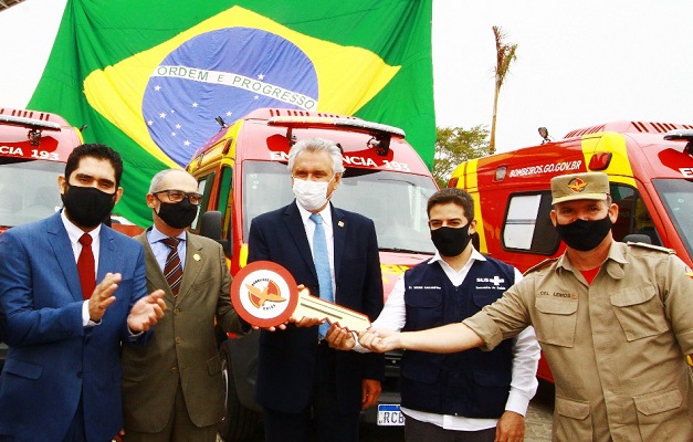 O governador Ronaldo Caiado inaugurou, nesta terça-feira (22/09), duas estruturas para o aprimoramento do trabalho do Corpo de Bombeiros Militar do Estado de Goiás (CBMGO) e entregou mais 11 veículos para a corporação, sendo um caminhão para abastecimento de aeronaves, cinco caminhonetes para o uso no salvamento em toda a capital e cinco ambulâncias.