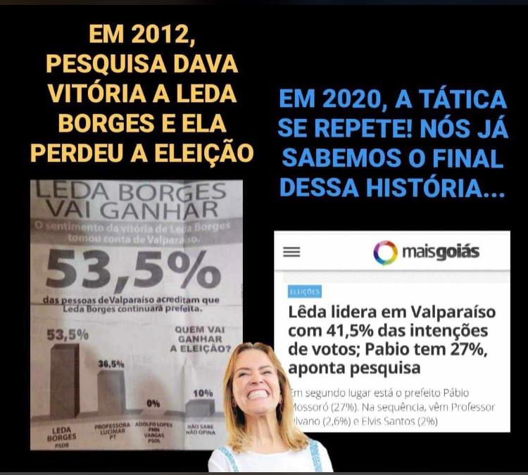 A lição do passado parece não servir de exemplo para a deputada. Em 2012, através de pesquisas duvidosas, Lêda Borges fez circular na cidade, “pesquisas” onde aparecia com 53,5% da preferência do eleitorado. Fechadas as urnas, Lêda amargou derrota acachapante. Agora ela quer repetir a tática, mas o final da história o eleitor de Valparaíso já conhece.