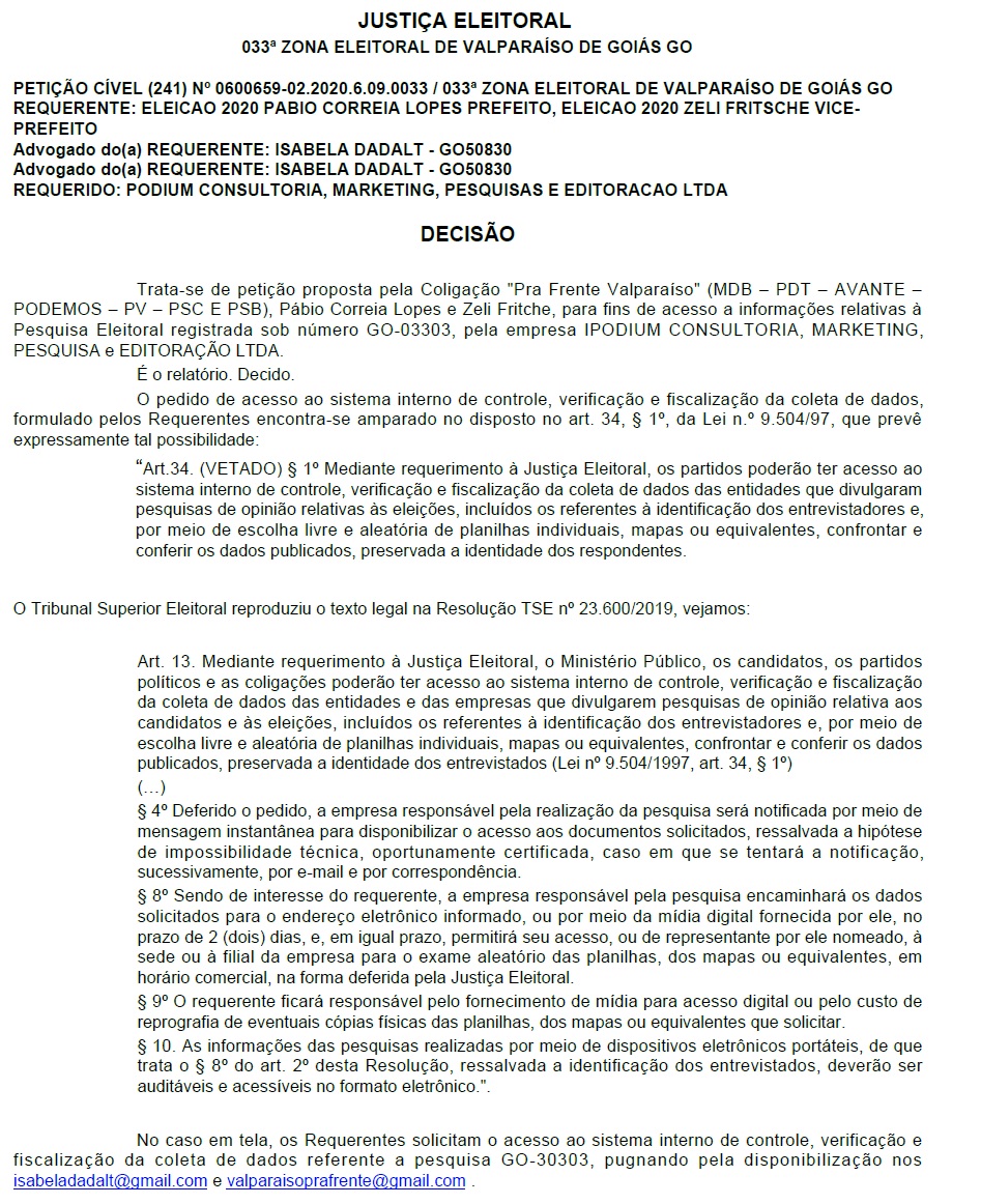 A 33ª Zona Eleitoral determinou a divulgação no prazo máximo de 48 horas, de informações relativas à Pesquisa Eleitoral registrada sob o número GO-03303, pela empresa PODIUM CONSULTORIA, MARKETING, PESQUISA e EDITORAÇÃO LTDA envolvendo disputa pela prefeitura de Valparaíso de Goiás .