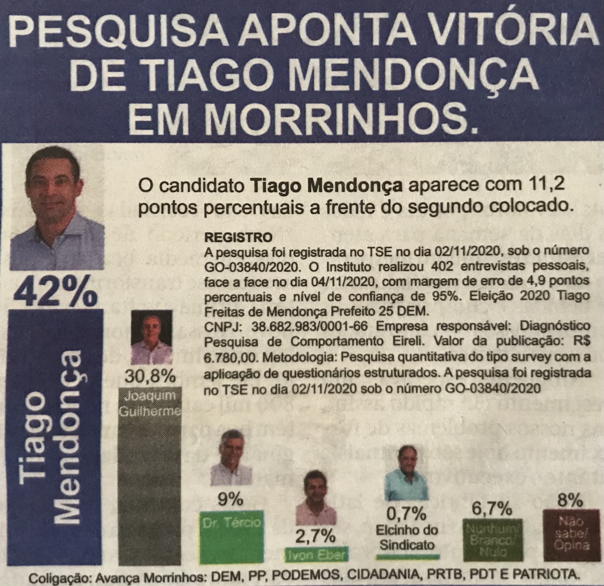 Nova rodada de pesquisa confirma a predominância do nome de Thiago Mendonça (Dem) para a Prefeitura de Morrinhos nas eleições deste domingo 15. O Instituto Cerrado Pesquisas, mostrou que o candidato da Coligação Avança Morrinhos, Tiago Mendonça está em 1º lugar com 9,13% a frente do 2º colocado, Joaquim Guilherme. A pesquisa divulgada hoje dia 12 de novembro pela TV Record Goiânia foi registrada no TSE Tribunal Superior Eleitoral com número GO-04132/2020 e realizada no dia 09 de novembro.