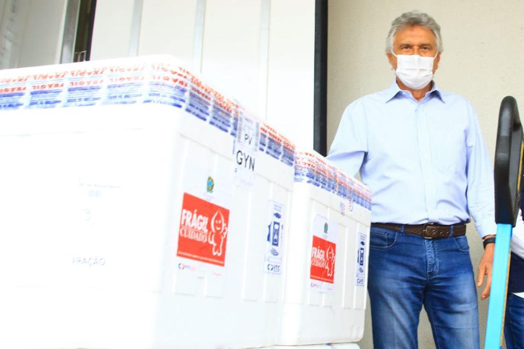 Ao receber as 77,8 mil doses da vacina Coronavac na manhã deste domingo,7, o governador Ronaldo Caiado informou que a remessa será suficiente para vacinar todos os idosos com mais de 85 anos do estado e boa parte dos que tem mais de 80. Ele tbm assegurou que as novas doses serão distribuídas aos municípios nesta segunda-feira,8.