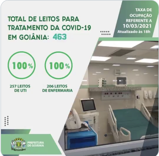 A conta da Prefeitura de Goiânia no Instagram, trouxe um alerta: Saúde Municipal está no limite. Segundo a postagem todos os 463 leitos destinados ao tratamento da Covid-19 na capital estão ocupados. São 257 leitos de UTI e 206 de enfermaria, “nenhuma vaga está disponível no momento.” De acordo com a administração do município,, foram abertos apenas neste ano 121 leitos UTI para Covid. Novos leitos estão progr