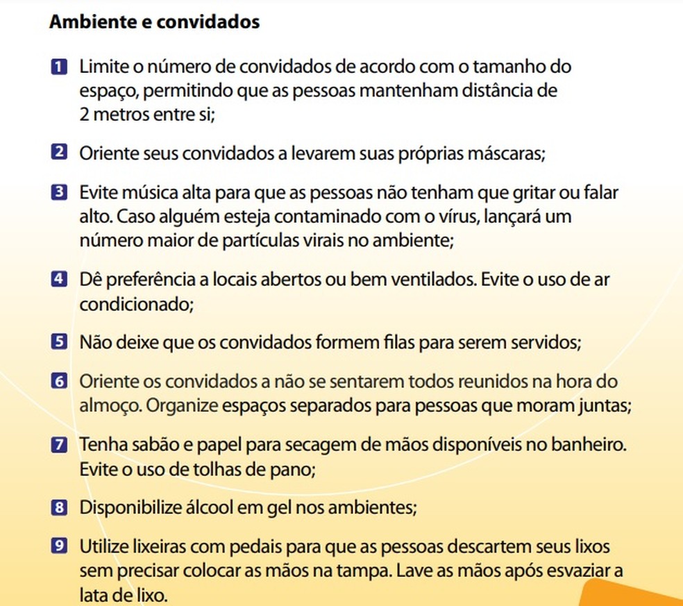 A cartilha traz também informações sobre o preparo e manuseio de alimentos, limite de pessoas e ventilação nos ambientes, descarte de lixo e disponibilização de álcool em gel. As recomendações sobre lavagem das mãos permanecem. No fim da cartilha, estão listadas as situações e as condições de saúde que impedem as pessoas de participarem de confraternizações.