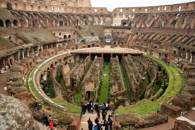 O subsolo do Coliseu só foi escavado há pouco mais de um século. Sobre ele era instalada uma cobertura de madeira onde eram despejadas toneladas de areia. Nessa intricada rede de salas, elevadores e jaulas ficavam os gladiadores e as feras antes de entrarem em cena.