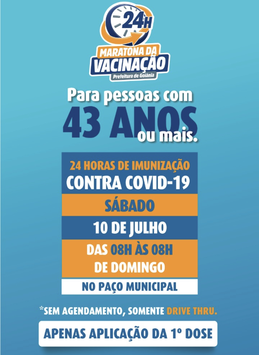 A Prefeitura de Goiânia realiza, neste final de semana, a primeira Maratona da Vacinação contra a Covid-19, no Paço Municipal, das 8h de sábado (10/7) às 8h de domingo (11/7), e será acompanhada pelo prefeito Rogério Cruz e pelo governador Ronaldo Caiado. A ação será no sistema drive thru, sem necessidade de agendamento. É destinada à aplicação da primeira dose do imunizante na população a partir de 43 anos, sem comorbidades. Além de carros, a população poderá utilizar moto e bicicleta para participar da ação.