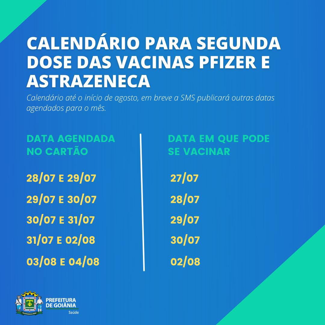 O intervalo é de 12 semanas entre as doses e o reforço está disponível, sem agendamento, em seis locais de Goiânia. O atendimento é das 8h às 17h e conforme as iniciais dos nomes, sendo que no período matutino para iniciais de A a L, e no período vespertino para iniciais de M a Z.