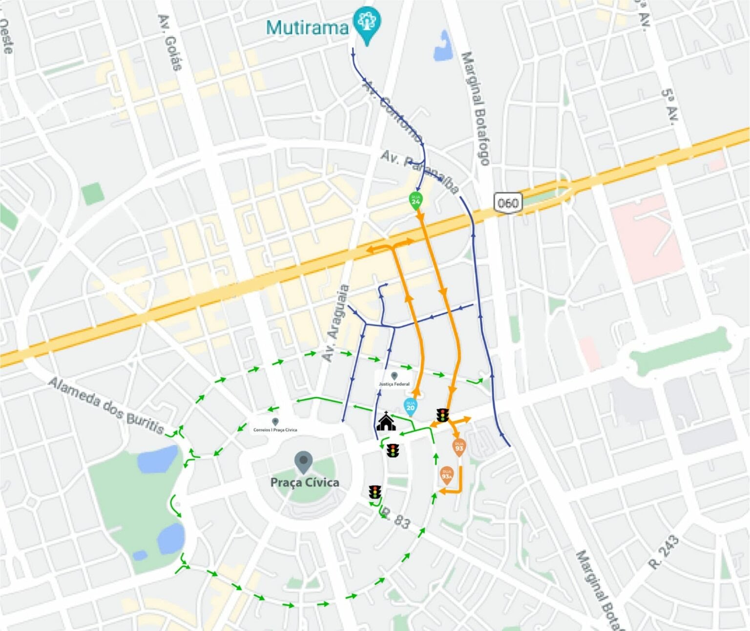 A Rua 20 a partir da Catedral Metropolitana passa a ter novo sentido de circulação da Rua 10 até a Avenida Anhanguera, com conversão à esquerda ou à direita.