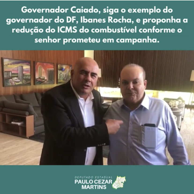 Em video que circula nas redes sociais, o deputado estadual Paulo Cézar Martins( MDB), ao lado do governador do DF, Ibaneis Rocha, também PMDB, desafia o governador Ronaldo Caiado para que cumpra, segundo ele, “o prometido na última campanha para governador e tirar o ICMS da gasolina.” O governador do DF faz coro e diz, no vídeo que ‘espera que o governador Ronaldo Caiado atenda ao pedido que é também do presidente da República para que os governadores diminuam o ICMS.” Paulo César encerra o vídeo, dizendo : E aí Caiado| Você prometeu agora cumpra| Eu quero votar no seu projeto lá na Assembleia Legislativa. Tamos juntos pelo Brasil”.