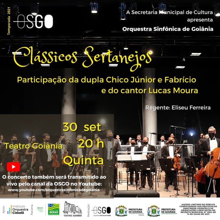“Clássicos Sertanejos” é uma proposta inédita da Orquestra Sinfônica de Goiânia, que apresentará um repertório de clássicos da música sertaneja arranjados para a formação. O evento terá a participação da dupla Chico Júnior e Fabrício, e do cantor sertanejo Lucas Moura, talentos em ascensão no gênero em Goiânia.