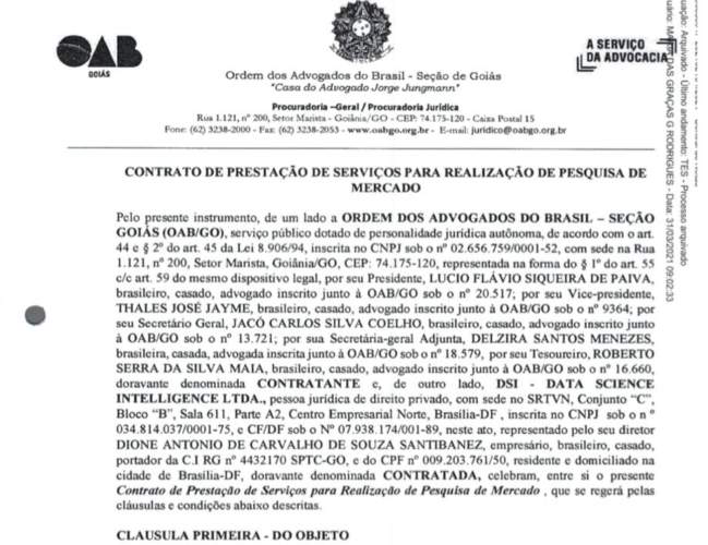 Conforme documentos obtidos, a DSI foi contratada pela OAB para um serviço de pesquisa por R$ 68.226,45, valor acima do praticado no mercado por outras empresas do segmento. O objeto, segundo o contrato, diz que a empresa seria responsável por um estudo qualitativo de mercado, mas que oficialmente não foi apresentado para os inscritos na OAB Goiás.