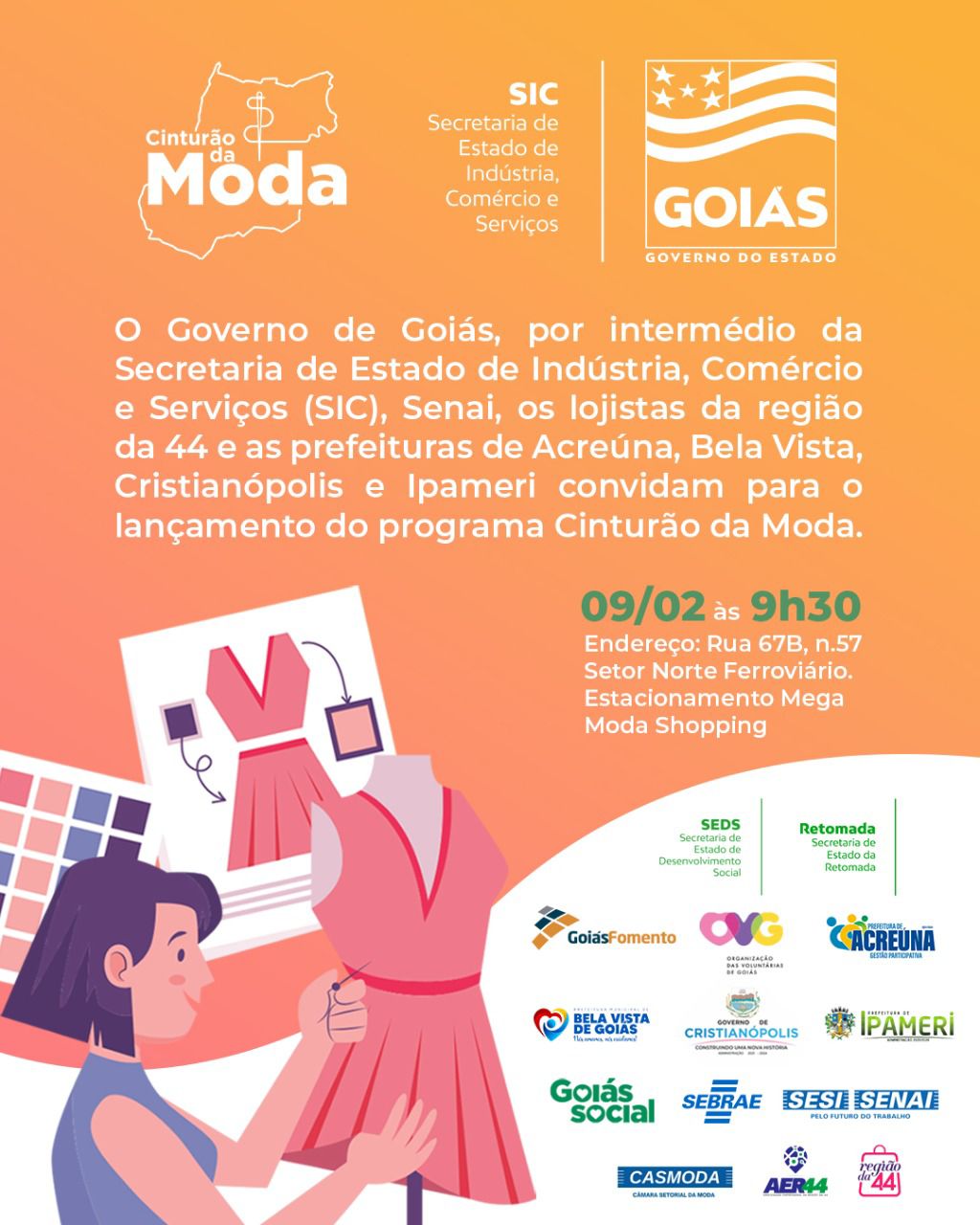 Ao longo dos últimos dois anos, a diretoria da Associação Empresarial da Região da 44 (AER44), por meio do projeto de Interiorização da Moda, realizou uma série de encontros e audiências com prefeitos e vereadores de vários munícipios goianos no sentido buscar áreas e condições para implantação de novos polos de confecção. O resultado desse trabalho, feito em parceria com o governo do Estado por meio da Secretaria de Indústria, Comércio e Serviços (SIC), se concretiza com o Programa Cinturão da Moda, que será lançado no próximo dia 9 de fevereiro, às 14h30, no estacionamento do Mega Moda Shopping, em Goiânia. O lançamento contará com a participação do governador Ronaldo Caiado e de vários prefeitos do interior.