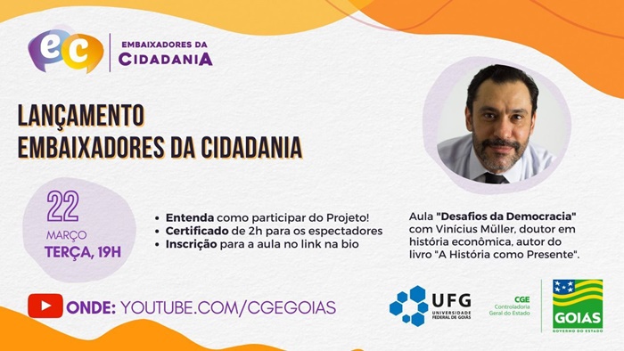 O lançamento ocorrerá durante live no canal da CGE no Youtube (youtube.com/cgegoias), às 19 horas da próxima terça-feira (22/03). A transmissão contará também com a presença do professor Vinicius Müller, doutor em história econômica e autor do livro “A História como Presente”, que falará sobre desafios da democracia, uma das temáticas do projeto.
