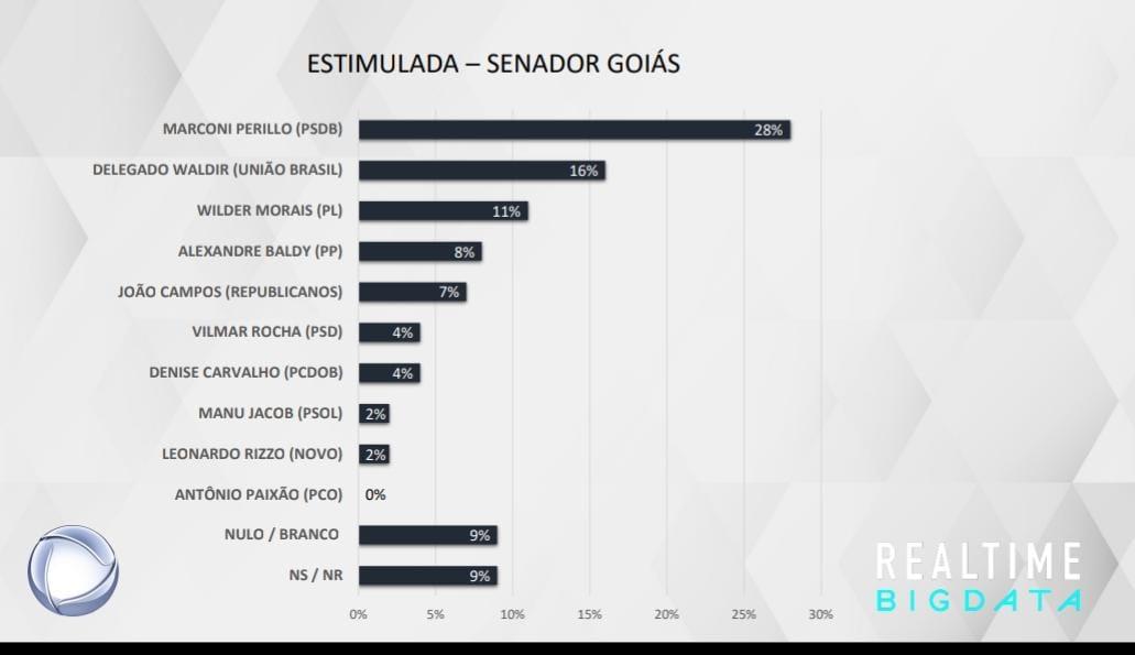O ex-governador Marconi Perillo (PSDB 456) segue na liderança da corrida pelo Senado, com 12% de vantagem em relação ao segundo colocado, o deputado federal Delegado Waldir (União Brasil).