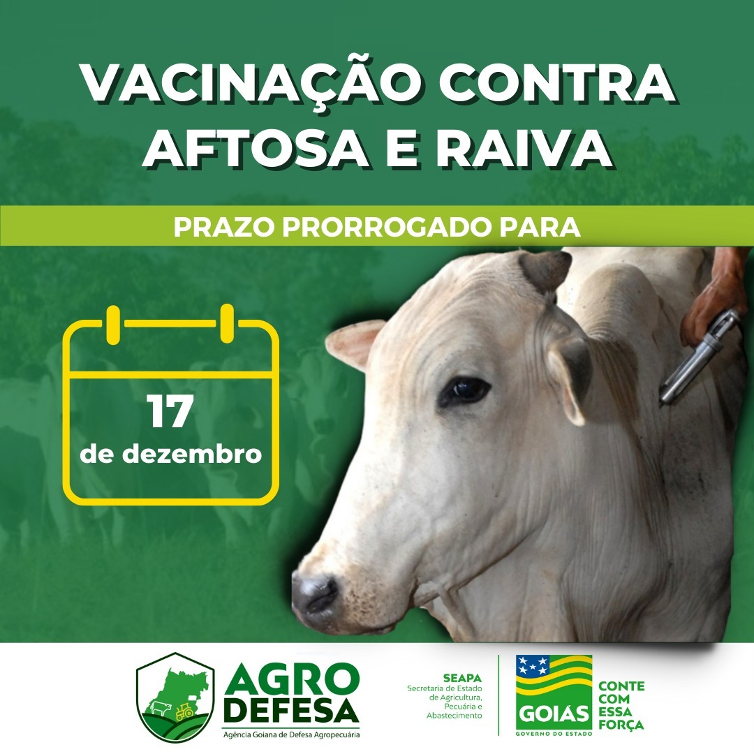 Em relação à raiva dos herbívoros, o prazo para vacinação de bovinos, bubalinos, caprinos, ovinos e equídeos também fica prorrogado até 17 de dezembro em 121 municípios considerados de alto risco para a doença em Goiás, já que as campanhas são desenvolvidas no mesmo período. Da mesma forma, a declaração de vacinação poderá ser feita até 24 de dezembro. A Agrodefesa vai elaborar e publicar na próxima semana Portaria alinhando os novos critérios de vacinação e declaração de vacinas.
