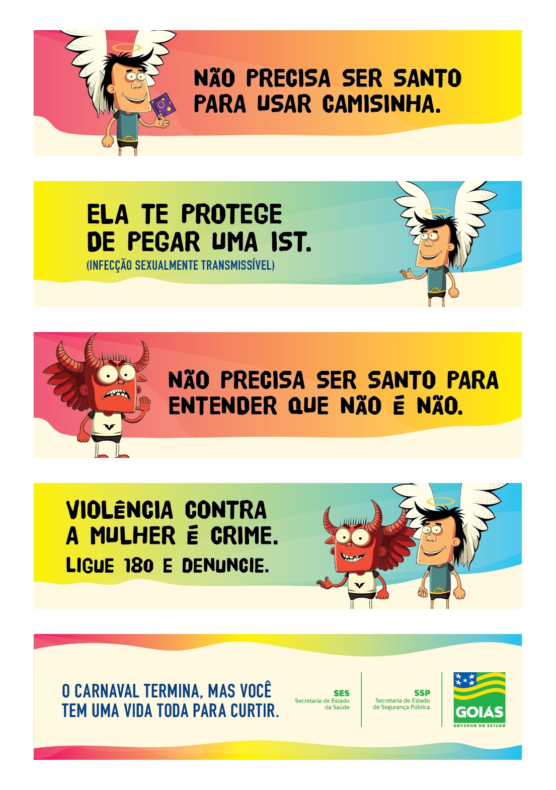 Veiculada durante o Carnaval, a ideia é orientar a população com o objetivo de evitar acidentes, promover a saúde e reduzir crimes contra a mulher por meio de uma mensagem bem-humorada, que utiliza de personagens símbolos dos conceitos de bem e mal, certo e errado para apresentar e defender o mote da campanha.