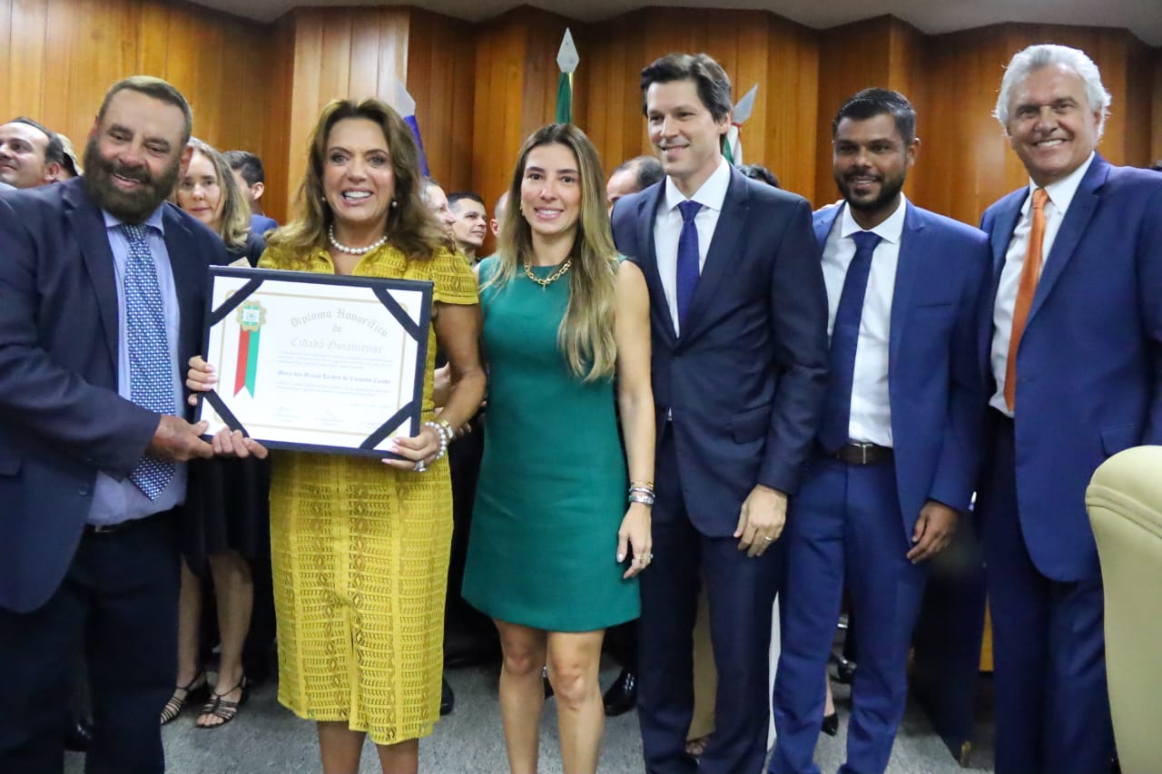 Em Sessão Solene da Câmara Municipal de Goiânia, nesta terça-feira (28), a primeira-dama do Estado de Goiás, Gracinha Caiado, recebeu título de cidadã goianiense. A solenidade, marcada pela emoção da homenageada,  contou com presença do governador Ronaldo Caiado; do presidente da Assembleia Legislativa, Bruno Peixoto; do vice-governador, Daniel Vilela; e de deputados, entre outras autoridades.