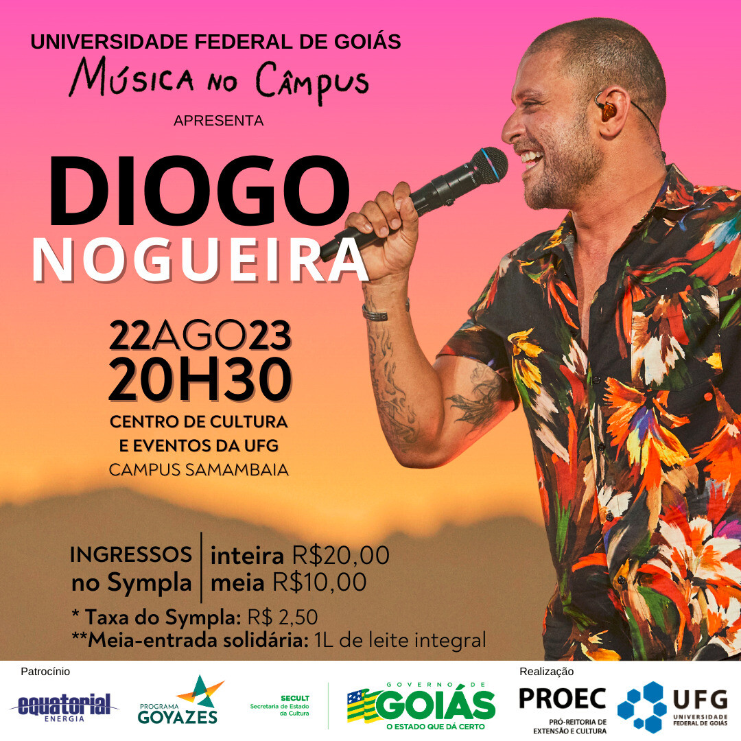 O segundo show da Temporada 2023 do Projeto Música no Câmpus da Universidade Federal de Goiás (UFG) vai ser realizado na terça-feira (22/8), às 20h30, no Centro de Cultura e Eventos Professor Ricardo Freua Bufáiçal, no Câmpus Samambaia, em Goiânia. O artista convidado é o cantor, Diogo Nogueira, compositor e instrumentista brasileiro, destacando-se como um dos principais nomes contemporâneos do samba no Brasil desde meados dos anos 2000.