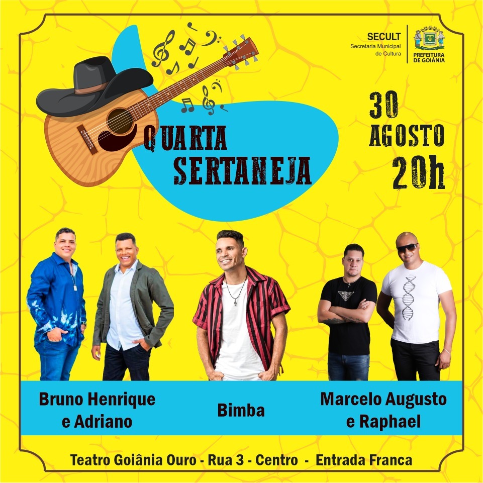 A Secretaria Municipal de Cultura (Secult), promove a segunda edição da ‘Quarta Sertaneja’, nesta quarta-feira (30/8), às 20h, no Teatro Goiânia Ouro, localizado na Rua 3, no Centro. Desta vez, sobem ao palco as duplas Bruno Henrique e Adriano, Marcelo Augusto e Rafael, e o cantor Bimba. O evento é gratuito e aberto ao público até a lotação do espaço. Não é preciso retirar ingressos antecipados.