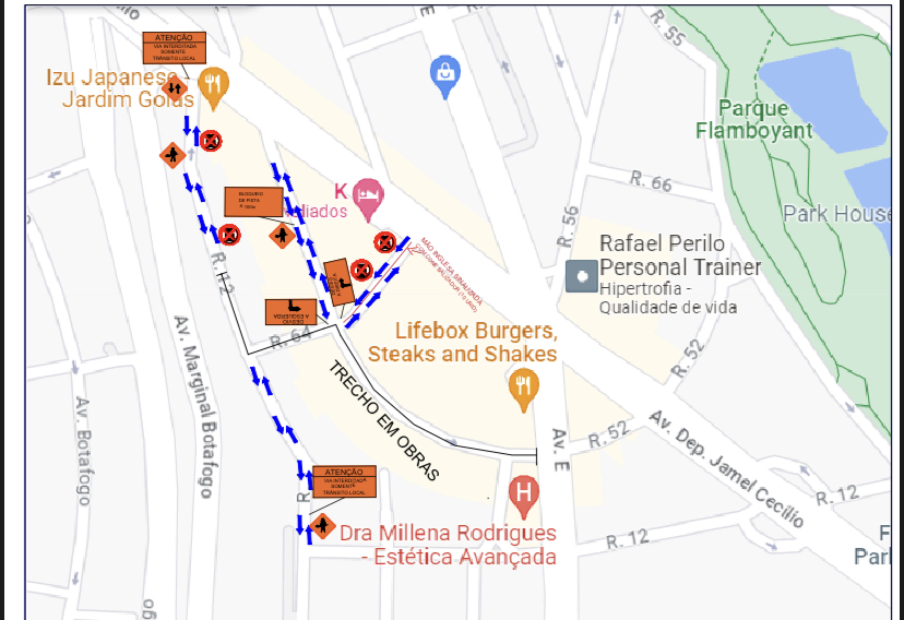 De acordo com a programação, a Rua 64 e a Rua 52 (entre a Avenida E e a Rua 64) serão totalmente bloqueadas. Já as Ruas 65 e 12 devem ter apenas acesso local com o uso de faixa inglesa. Para quem sobe a Avenida Jamel Cecílio e precisa acessar a Rua 52, depois da Rua 65, o trecho estará totalmente bloqueado até a Avenida E.