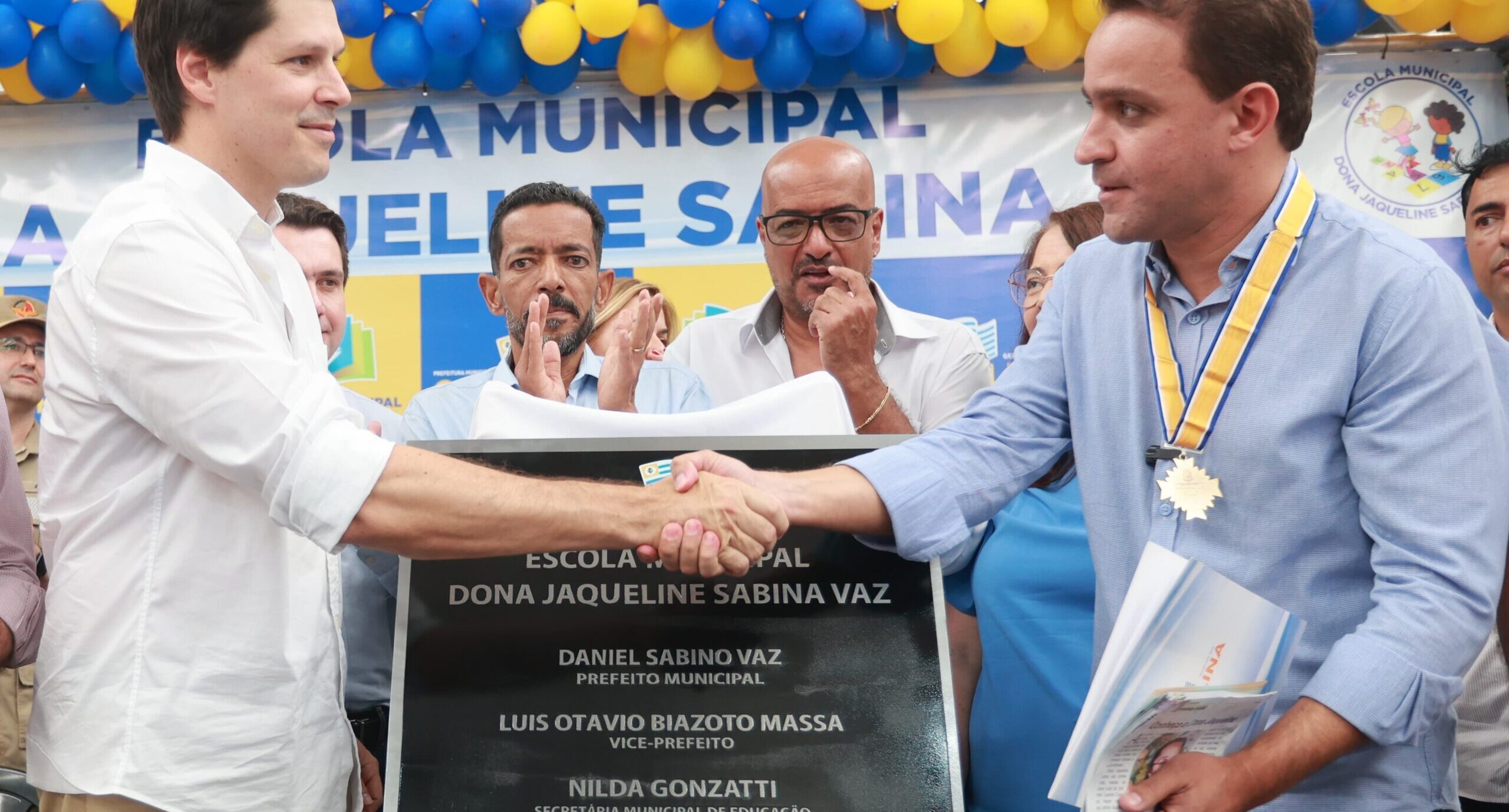 Homenagem – A Escola Municipal Dona Jaqueline Sabina Vaz já está em funcionamento com 360 alunos matriculados e 46 servidores. Daquele total, 180 cursam o 4º e o 5º anos da primeira fase do Ensino Fundamental e o 6º ano da segunda fase. Outros 220 estão divididos entre os 1º, 2º e 3º ano da primeira fase do Fundamental.