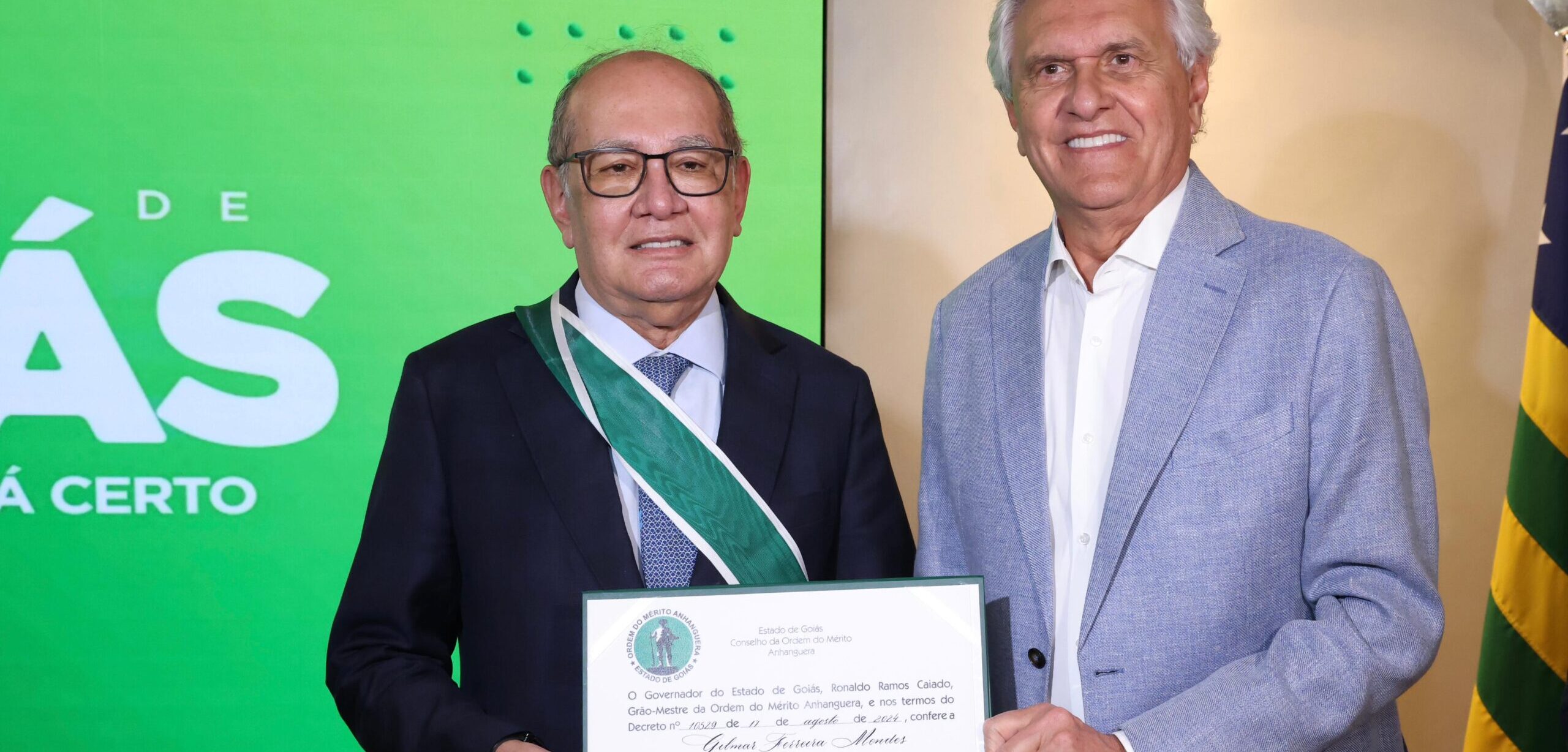 O governador Ronaldo Caiado entregou, neste sábado, 17, a Comenda da Ordem do Mérito Anhanguera ao ministro do Supremo Tribunal Federal (STF), Gilmar Mendes, no Palácio das Esmeraldas, em Goiânia. A honraria é a mais importante concedida pelo Estado. Criada em 1975, ela prestigia autoridades, personalidades e corporações que se destacam por serviços e ações relevantes para Goiás.