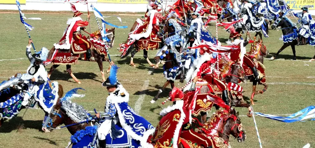 As Cavalhadas são uma representação tradicional dos torneios medievais que recriam as batalhas entre cristãos (vestidos de azul) e mouros (trajados de vermelho). A manifestação é inspirada no livro “Carlos Magno e Os Doze Pares da França”, quando o guerreiro cristão batalhou contra os sarracenos, de religião islâmica.
