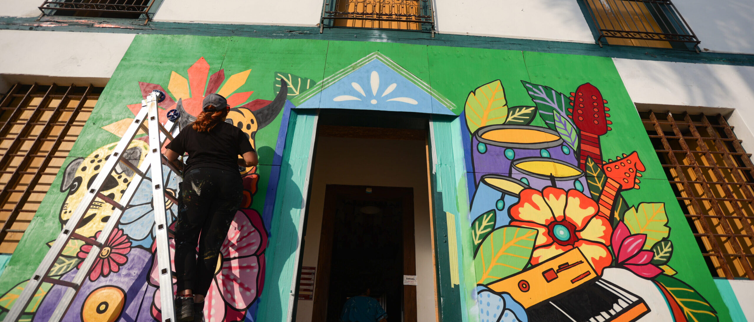 A histórica Pirenópolis recebeu, durante a programação do Canto da Primavera 2024, uma intervenção artística urbana no centro histórico do município. A obra de arte de 15m², localizada temporariamente no Museu do Divino, chama a atenção pelas cores e pela representação de elementos bastante característicos da cidade. Feito com técnicas de spray e acrílico, o painel grafitado é de autoria da artista goiana Thainá Junger e é um presente da 23º edição do festival para o município.