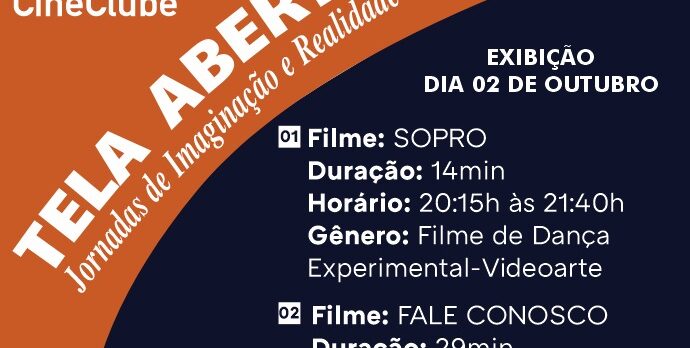 O projeto “Tela Aberta – Jornadas de Imaginação e Realidade”, produzido pela Cereja do Cerrado Produções, com coordenação da Associação SuperAção Criativa, realiza, a partir desta quarta-feira (2/10), as exibições dos filmes selecionados para integrarem o projeto. Nesta primeira sessão, a ser realizada na Toca Arena Produções, a partir das 20h15, serão apresentados o filme de dança Sopro, dirigido por Márcia Regina, e Fale conosco, documentário de 29 minutos assinado por Simone Caetano.