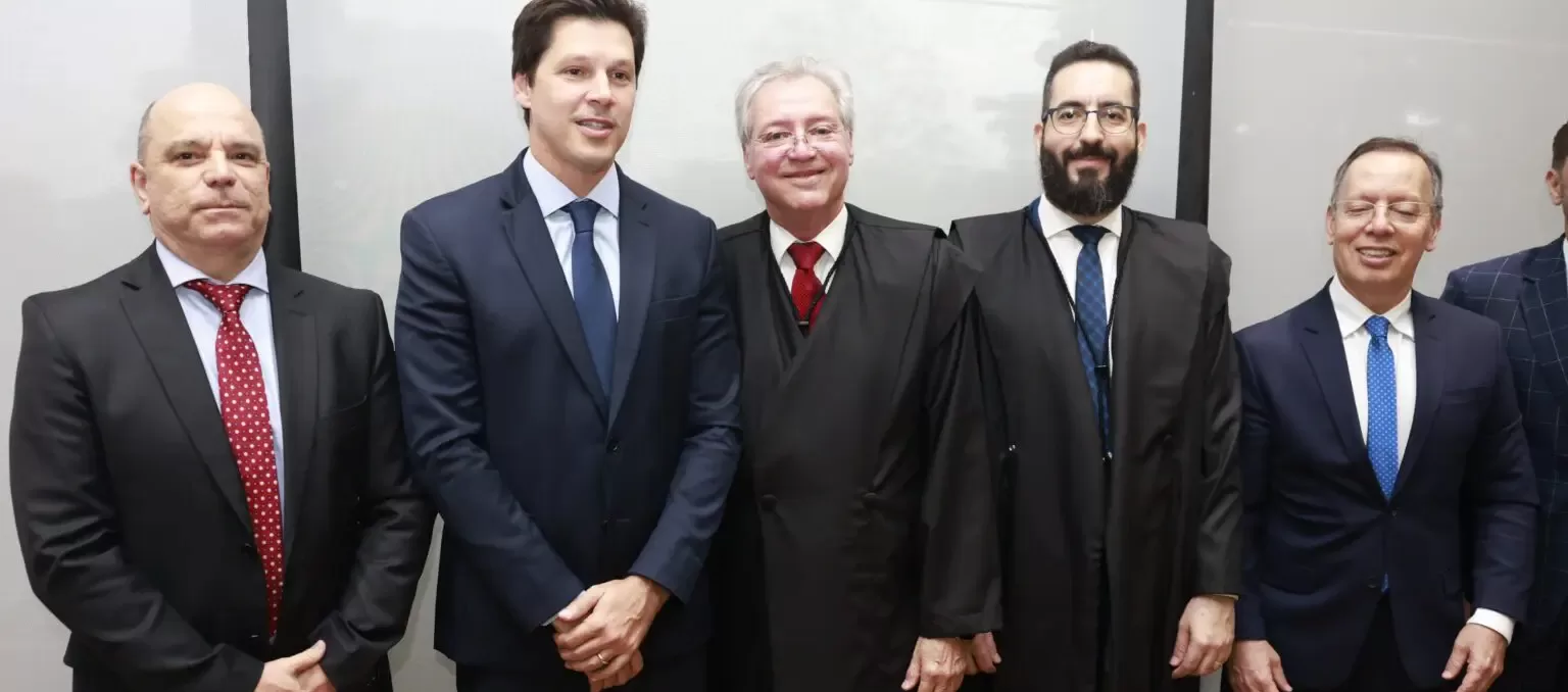 O vice-governador Daniel Vilela prestigiou, na tarde desta terça-feira (10/12), a posse da nova mesa diretora do Tribunal de Contas do Estado de Goiás (TCE-GO). O conselheiro Helder Valin estará à frente da Corte no biênio 2025-2026. Ele assume a partir de 1º de janeiro do ano que vem no lugar de Saulo Mesquita.