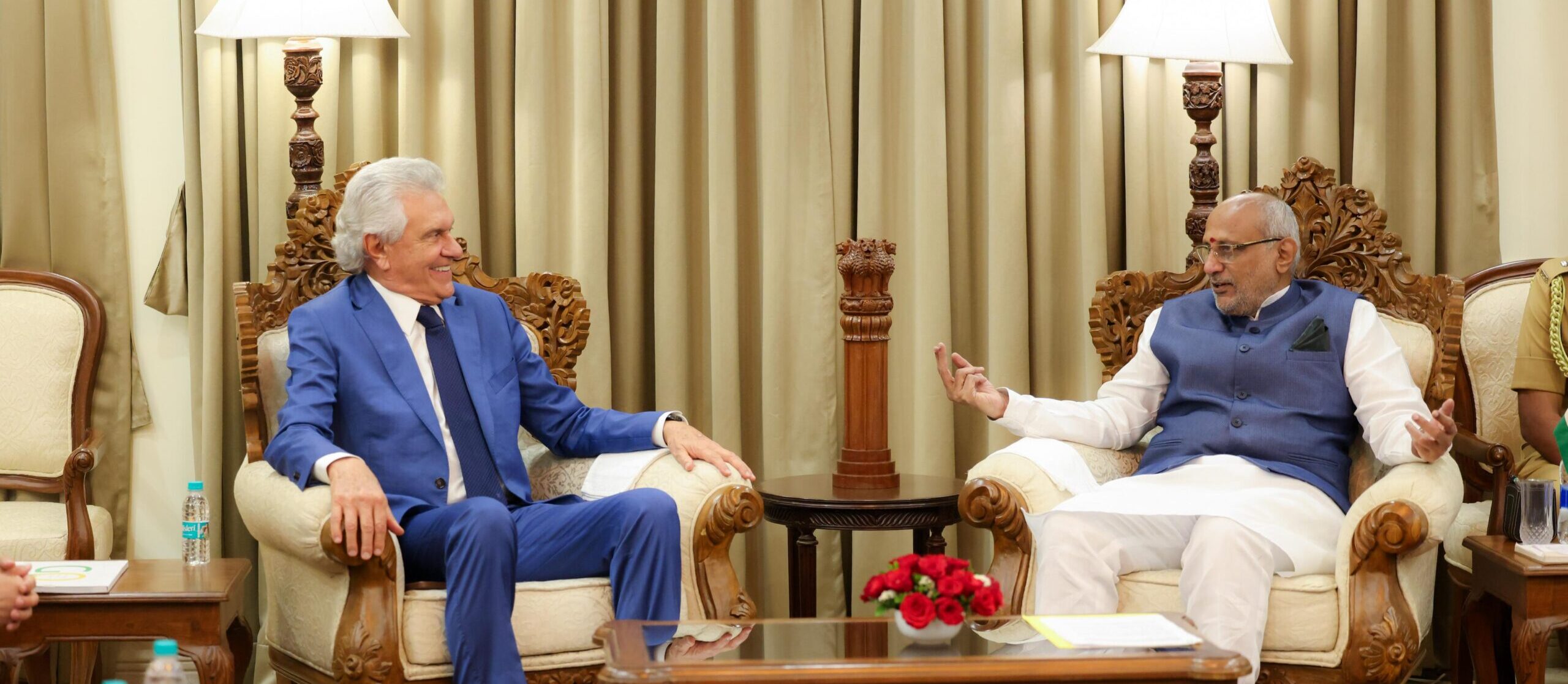 Reciprocidade – Na sequência de compromissos, o governador Ronaldo Caiado esteve com o governador do Estado de Maharashtra, C. P. Radhakrishnan para trocar experiências e conhecer o planejamento institucional do estado indiano. Com múltiplos temas abordados, o líder goiano defendeu parcerias para desenvolver áreas estratégicas como novos modais de transporte, infraestrutura e transição energética. “Nós temos fontes renováveis que, sem dúvida alguma, trabalham fortemente para a descarbonização. Me impressionou muito o projeto do governo da Índia que se propõe a atingir, em 2070, a total descarbonização aqui do país”, comentou Caiado.