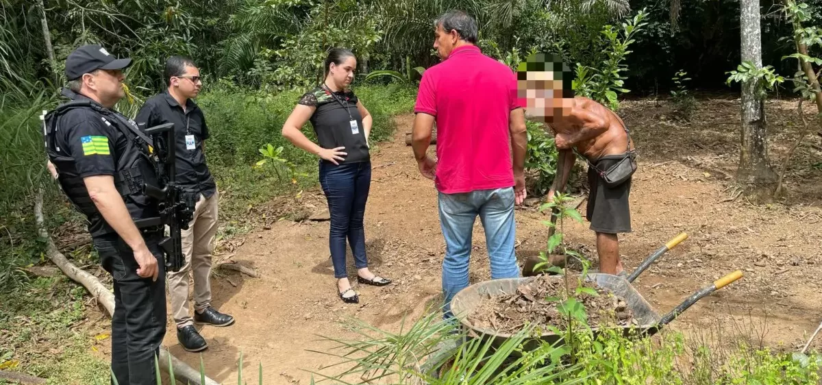 No local, as equipes da PCGO e do MPGO identificaram a vítima na área externa da residência (quintal), executando trabalho braçal, utilizando uma pá e um carrinho de mão. Durante a entrevista preliminar, a vítima relatou estar prestando serviços no local há aproximadamente oito anos, sem receber qualquer contraprestação pecuniária ou assistência financeira, limitando-se a dispor de alimentação e moradia.