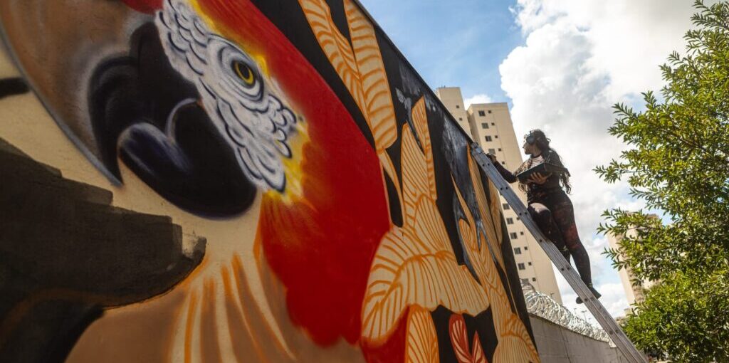 O mural transforma o espaço público em uma galeria a céu aberto, celebrando a arte, a memória coletiva e a valorização das periferias. A técnica de Jessica Muriel combina pintura acrílica e spray, utilizando tinta sintética dourada para remeter às riquezas históricas do Brasil. A obra traz uma composição que celebra a fauna e a cultura brasileiras, com destaque para o lobo-guará, a arara, o caju e elementos indígenas. “Esse mural é uma forma de conectar a comunidade ao espaço, criando vínculos afetivos e visuais com a rua. É uma arte que ocupa e comunica”, afirma a artista.