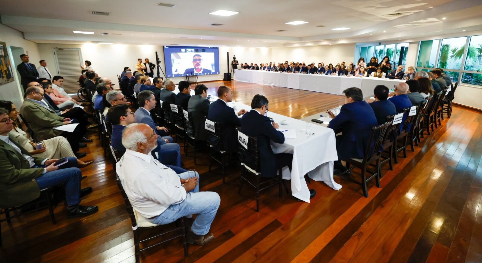 O governador Ronaldo Caiado apresentou, em reunião com empresários na tarde desta terça-feira (22/7), as linhas de crédito lançadas pelo governo de Goiás para minimizar os impactos financeiros decorrentes da tarifação imposta pelos Estados Unidos ao Brasil. A reunião ocorreu no Palácio das Esmeraldas e contou com a presença de representes de diversos setores de Goiás.