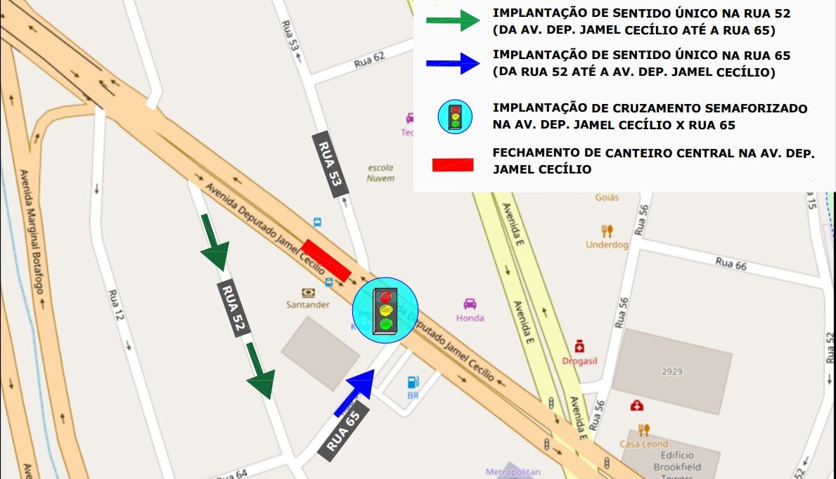 Outra modificação ocorre nas proximidades do Hotel K, onde a Rua 52, antes mão dupla, passa a ter sentido único da Avenida Jamel Cecílio para a Rua 65. Já esta terá o sentido invertido, com fluxo da Rua 52 para a Avenida. Neste ponto também foi implantado um cruzamento semaforizado, permitindo a quem sair da Rua 65 virar à direita ou à esquerda na Jamel Cecílio, além de acessar a quadra oposta pela Rua 53, no sentido sul-norte.